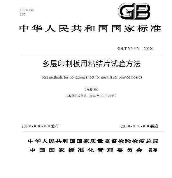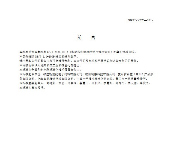 國家標準GB/T YYYY-201X《多層印制板用粘結片試驗方法》由咸陽瑞德科技有限公司與福建新世紀電子材料有限公司廣東生益科技有限公司、上海南亞覆銅箔板有限公司、莆田市產(chǎn)品質量檢驗所、中國電子技術標準化研究院共同負責起草。