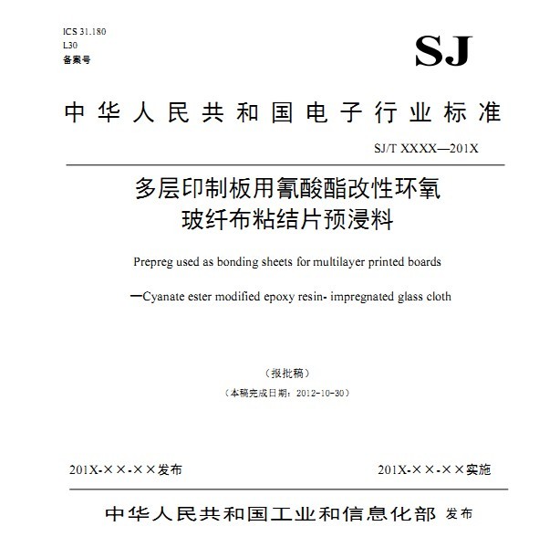 SJ/T XXXX-201X《多層印制板用氰酸酯改性環(huán)氧玻纖布粘結(jié)片預(yù)浸料》