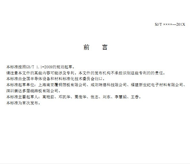 電子行業(yè)標(biāo)準(zhǔn)SJ/T XXXX-201X《多層印制板用氰酸酯改性環(huán)氧玻纖布粘結(jié)片預(yù)浸料》由咸陽(yáng)瑞德科技有限公司與上海南亞覆銅箔板有限公司、福建新世紀(jì)電子材料有限公司、深圳崇達(dá)多層線路板有限公司負(fù)責(zé)起草。